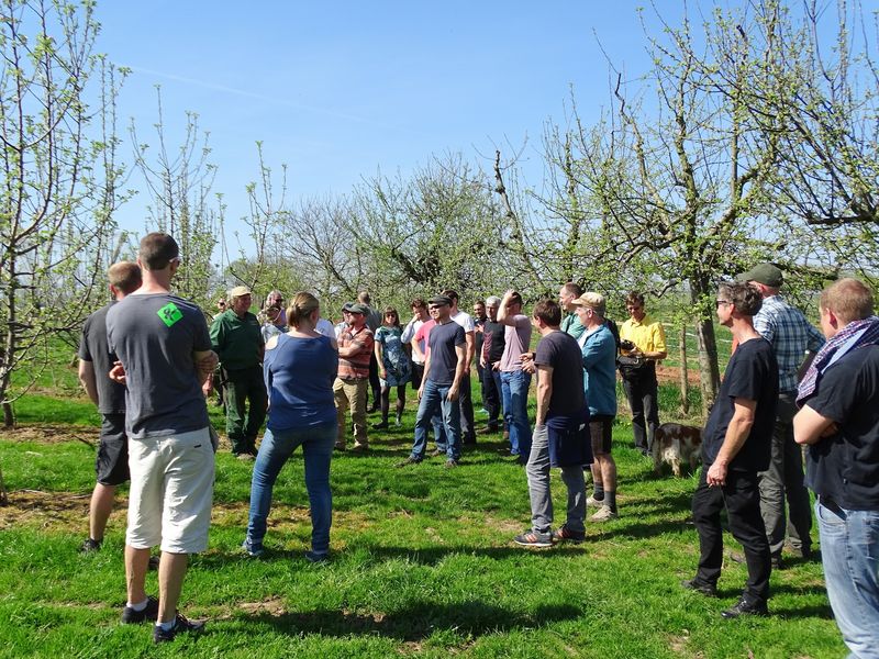 Baumschnitt unter völlig anderen Kriterien erlebten die Teilnehmer der Tagung bei der Exkursion auf den Obsthof Sauerbier in Grünberg. Die Schnitttechnik erfolgt im Ertragsobstbau unter anderen Gesichtspunkten als bei der allgemeinen Baumpflege u.a. in der Pflege von Streuobstwiesen. Das Thema Artenschutz zeigte sich in einer ausgebreiteten Bruthöhle aber auch hier.