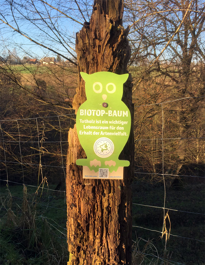 Bäume, die nach menschlichen Gesichtspunkten nicht mehr ansehnlich erscheinen, sind oft ein wichtiger Lebensraum für Insekten und andere Tiere. Um mehr Verständnis für Habitatbäume zu wecken und vorschnelles Fällen zu vermeiden, hat der Fachverband geprüfter Baumpfleger (FgB) eine naturnahe Kennzeichnung entwickelt.
